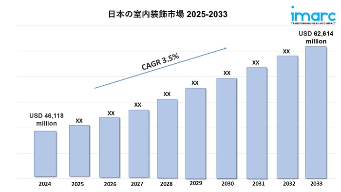 IMARCグループの最新の研究発表によると、「日本ホームデコレーション市場レポート:製品タイプ別(家庭用家具、ホームテキスタイル、床材、壁装飾、照明、その他)、流通チャネル別(ホームデコレーションストア、スーパーマーケット&ハイパーマーケット、オンラインストア、ギフトショップ、その他)、地域別 2025-2033」日本のホームデコレーション市場規模は、2024年に461億1,800万米ドルに達しました。今後、IMARCグループは、この市場が2033年までに626億1,400万米ドルに達し、2025年から2033年の間に3.5%の年平均成長率(CAGR)を示すと予測しています。