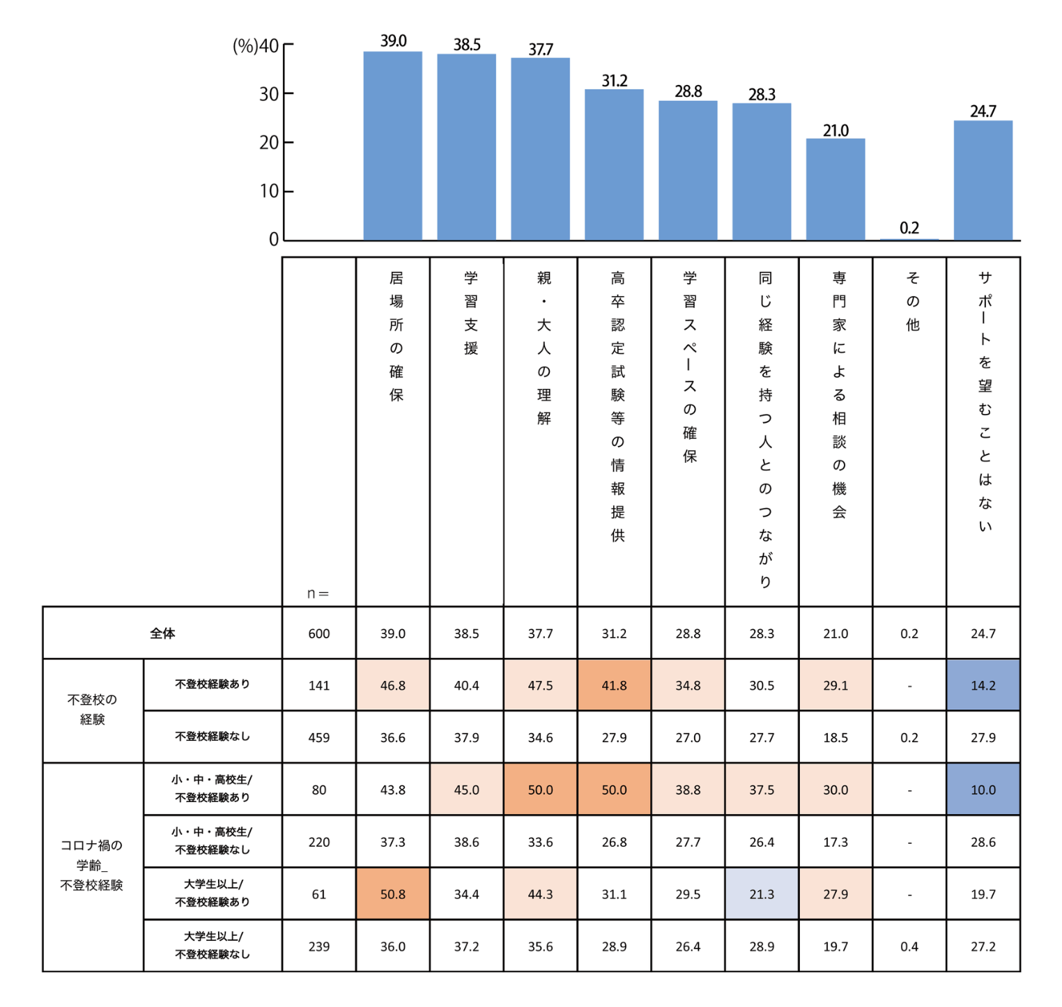 最も割合の高い回答は「居場所の確保」で39.0%でした。次いで「学習支援」が38.5%、「親・大人の理解」が37.7%、「高卒認定試験等の情報提供」が31.2%と続いています。