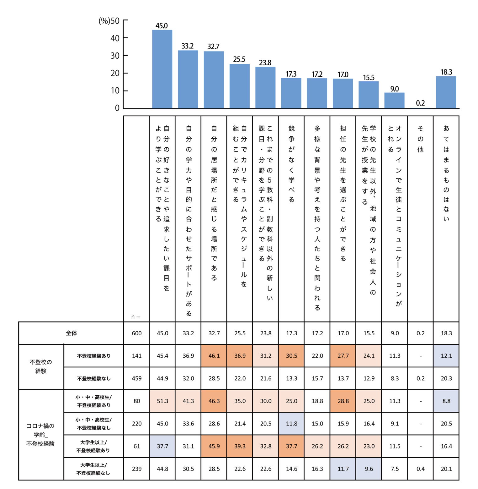 全体では「自分の好きなことや追求したい課目をより学ぶことができる」という回答が45.0%もの支持を得ました。次いで「自分の学力や目的に合わせたサポートがある」が33.2%、「自分の居場所だと感じる場所である」が32.7%と続いています。