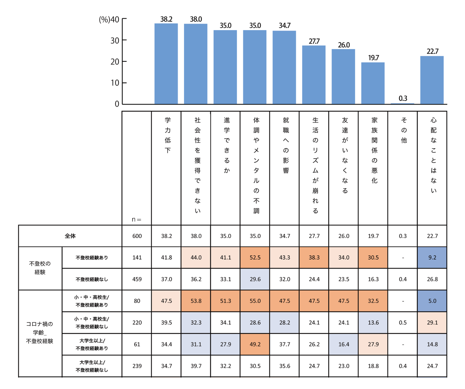 最も割合の高い回答は「学力低下」で38.2%でした。次いで「社会性を獲得できない」が38.0%、「進学できるか」と「体調やメンタルの不調」が共に35.0%と続いています。