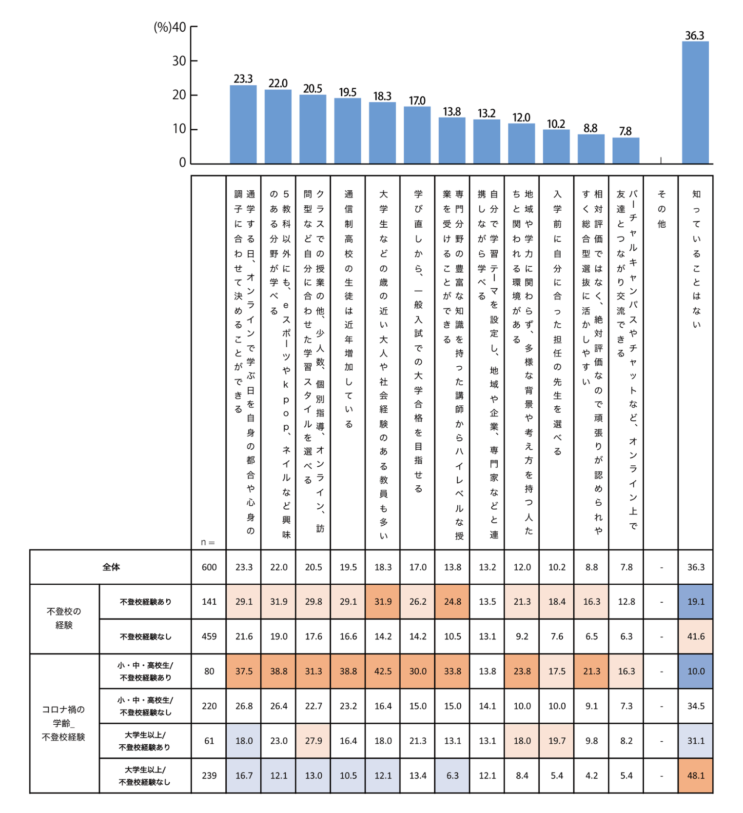 最も高かったのは「通学する日、オンラインで学ぶ日を自身の都合や心身の調子に合わせて決めることができる」で23.3%でした。次いで「5教科以外にも、eスポーツやK-POP、ネイルなど興味のある分野が学べる」が22.0%、「クラスでの授業の他、少人数、個別指導、オンライン、訪問型など自分に合わせた学習スタイルを選べる」が20.5%と続きました。