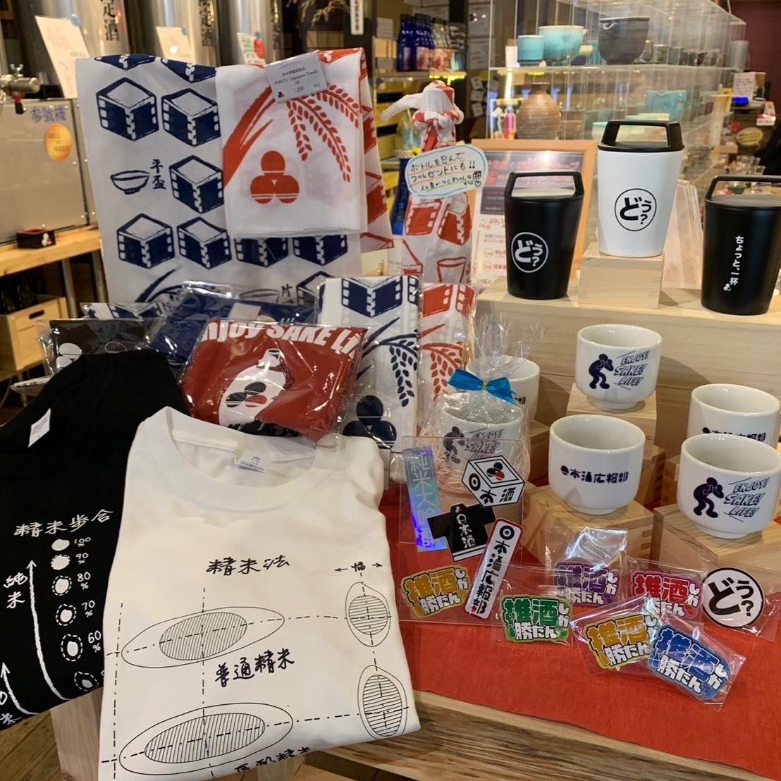 お猪口、Tシャツ、手拭い、ステッカー等日本酒を愛してやまないスタッフが生み出すオリジナルグッズを販売。