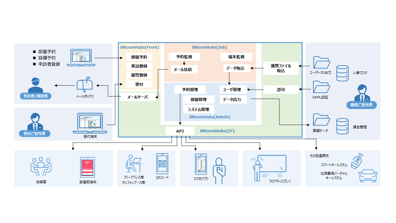 BRoomHubs v3は会議室やフリーアドレスの席、テレフォンブース、Web会議ブースなどの施設、TV会議セットから社用車に至るまでの設備の予約管理と、来訪者管理(受付支援機能)を保有したクラウドサービスです。個々の管理対象に利用権限の付与ができ、環境や利用状況にあわせたルールの設定が可能になります。