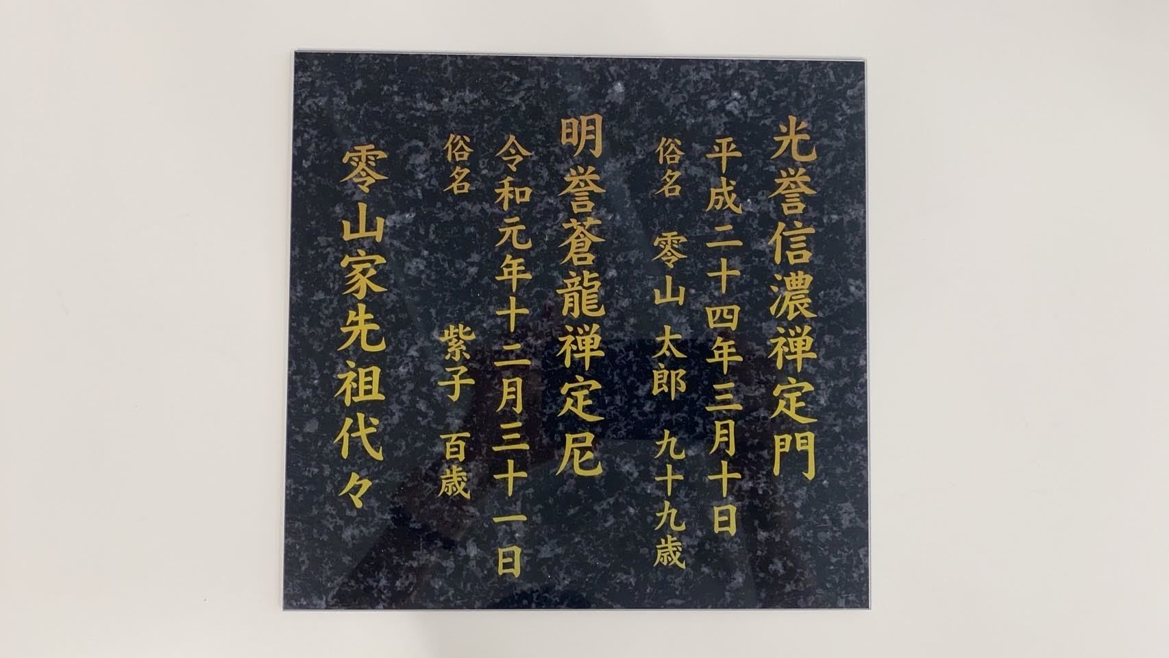 *全国的に他の納骨堂では厨子(ご遺骨を入れる箱)に取り付けるお名前プレート(写真参考)は石で作られていますが、海泉寺では日本国内製造のアクリルプレートを使ってデザインが決まれば1週間ほどで製作可能です。アクリルプレートは丈夫で透明感と光沢があるので大変綺麗に仕上がります。また別途同じデザインのプレートを家用としてオリジナルサイズで作ることもできます(費用は別途必要です)。お参りする家族だけが目にするモノなのでデザインは完全に自由です。思い出の写真を入れたりオリジナルデザインにしたり、たとえば自作の絵やCGを入れることなどをデザイナーさんと相談いただけます。著名なデザイナーさんに依頼することもできます。