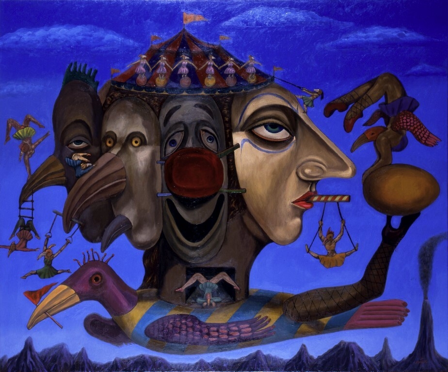 1965年ラグビーで岐阜国体に出場時、スクラム練習中に負傷。暗中模索のあと絵の世界に方向性を見出し、画家を志す。サーカスと道化師の世界に魅せられ、1973年からサーカスの絵を発表。彼らを訪ねて世界を旅し交流を続け、一生のテーマとして取り組んだ。
