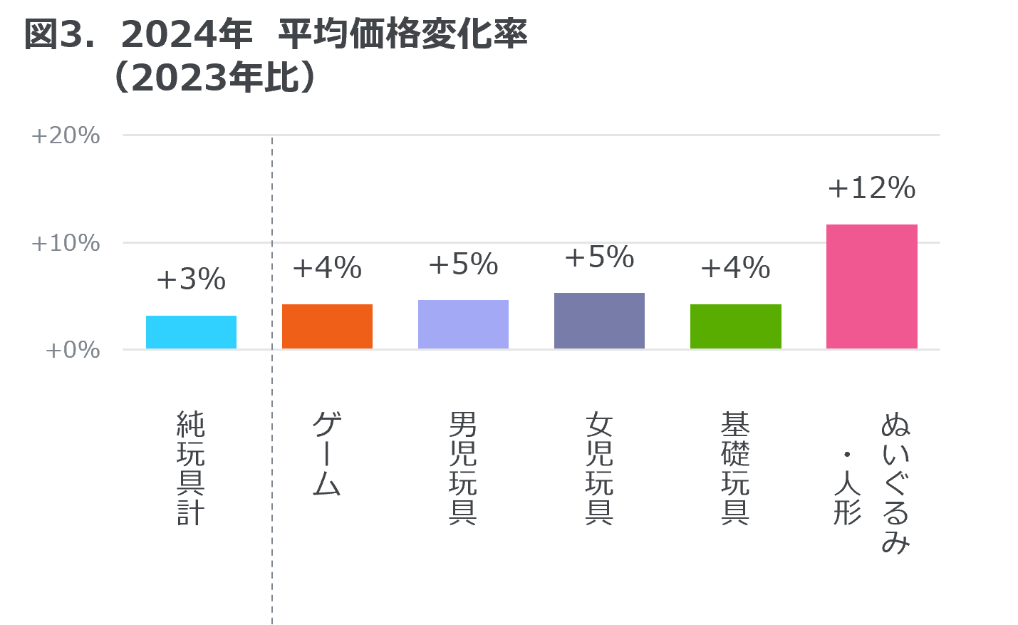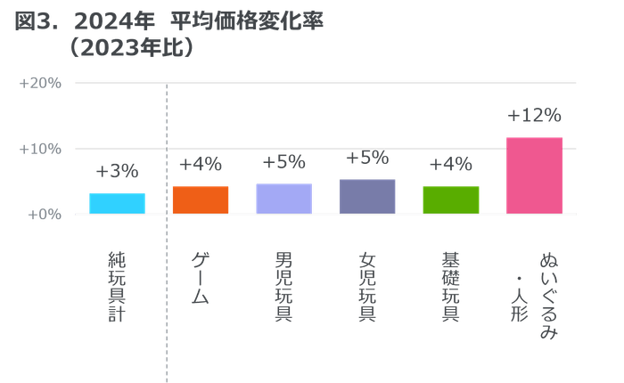 純玩具内の金額構成比は4%程度ながら、伸長率が最も高かった大分類が「ぬいぐるみ・人形」だ。「うまれて!ウーモ アライブ」、「ちいかわ」、各種サンリオキャラクターなどが金額拡大をけん引した。平均価格の上昇傾向が全体的にみられる中で特に、比較的高単価のアクションぬいぐるみが販売数を大きく伸ばしたことで、「ぬいぐるみ・人形」の平均価格は約12%上昇した(図3)。