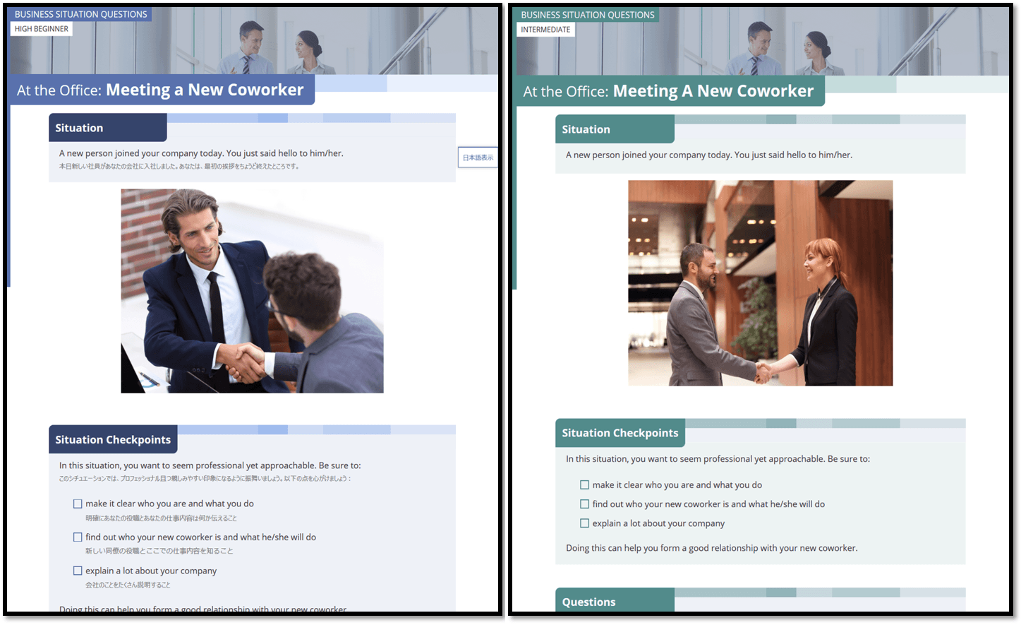 初中級者・中級者向けの、ビジネスシーンを想定したスモールトーク教材です。職場や出張先など、よくあるシーンでの会話がスムーズにできるようになります。新入社員との挨拶、会食などのシーンで言葉に詰まった経験がある方や、今後そのようなことがあり得る方におすすめです。