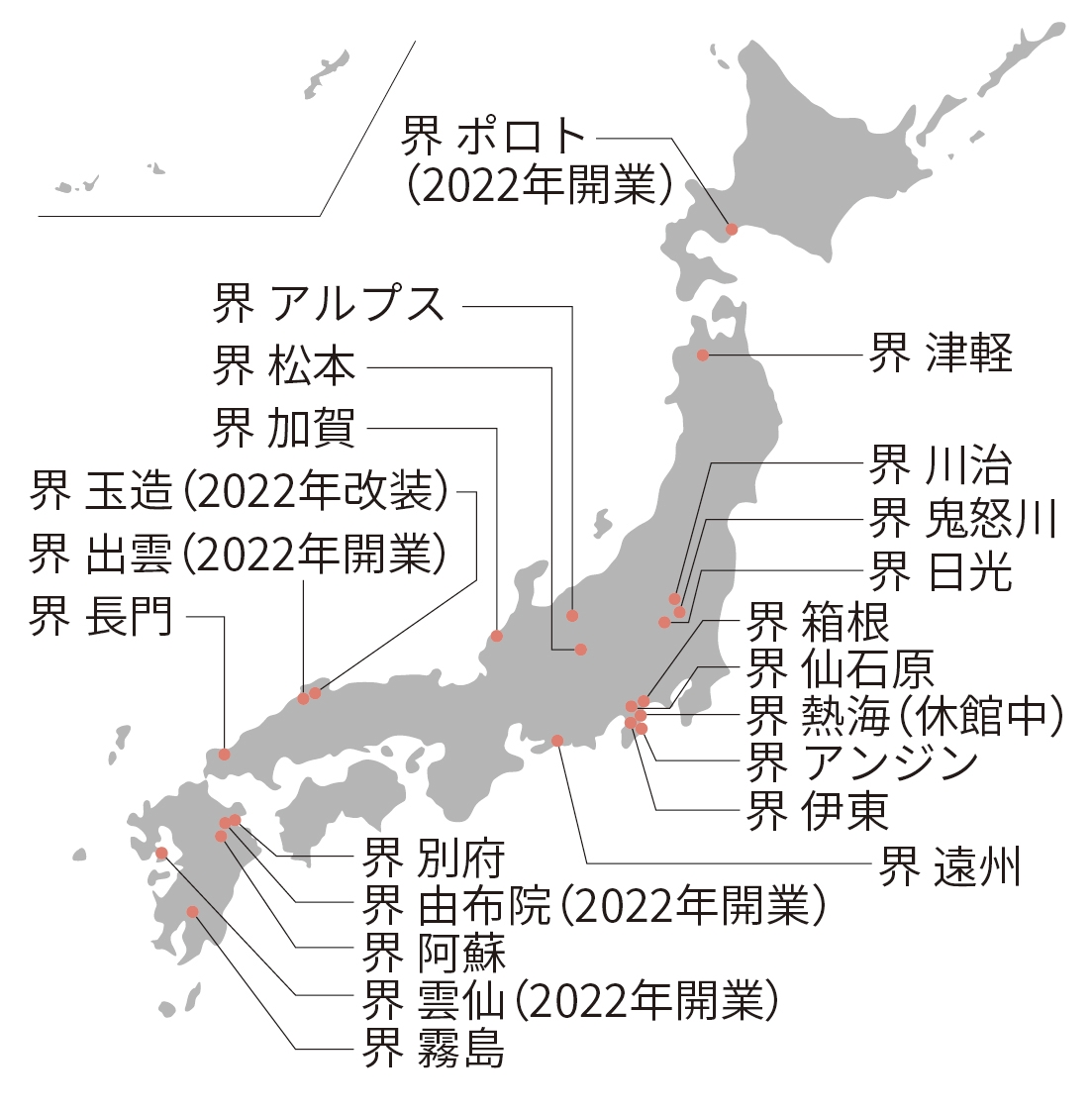 「界」は星野リゾートが全国に展開する温泉旅館ブランドです。「王道なのに、あたらしい。」をテーマに、季節の移ろいや和の趣、伝統を生かしながら現代のニーズに合わせたおもてなしを追求しています。また、その地域の伝統文化や工芸を体験する「ご当地(とうち)楽(がく)」や、地域の文化に触れる客室「ご当地部屋」が特徴です。現在、全国各地に展開しており、2022年11月には、「界 玉造」が島根県・玉造温泉にて改装をへて再開業、「界 出雲」が同県・出雲ひのみさき温泉に、「界 雲仙」が長崎県・雲仙温泉に新規開業します。
