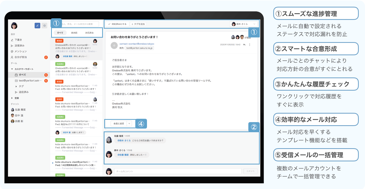 yaritoriは、複数人でのメール対応・管理を効率化するクラウド型のメール共有システムです。