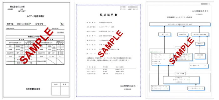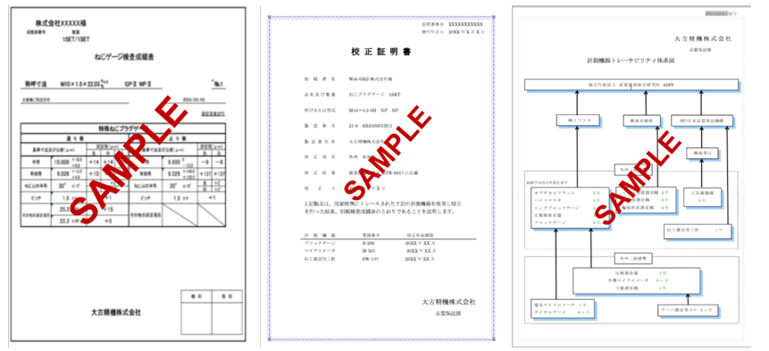 当サービスでは全数検査の上、「検査成績表」「校正証明書」「トレーサビリティ体系図」を添付して納品します。