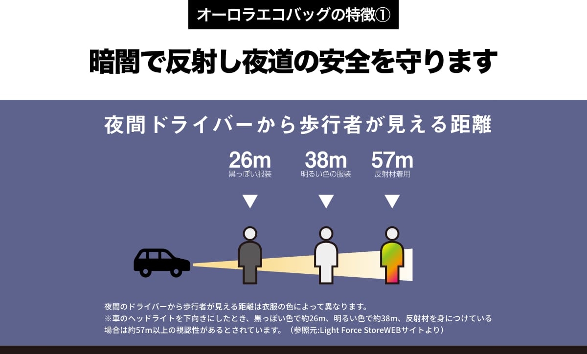 夜間のドライバーから歩行者が見える距離は衣服の色によって異なります。 ※車のヘッドライトを下向きにしたとき、黒っぽい色で約26m、明るい色で約38m、反射材を身につけている場合は約57m以上の視認性があるとされています。※参照元:Light Force StoreWEBサイトより