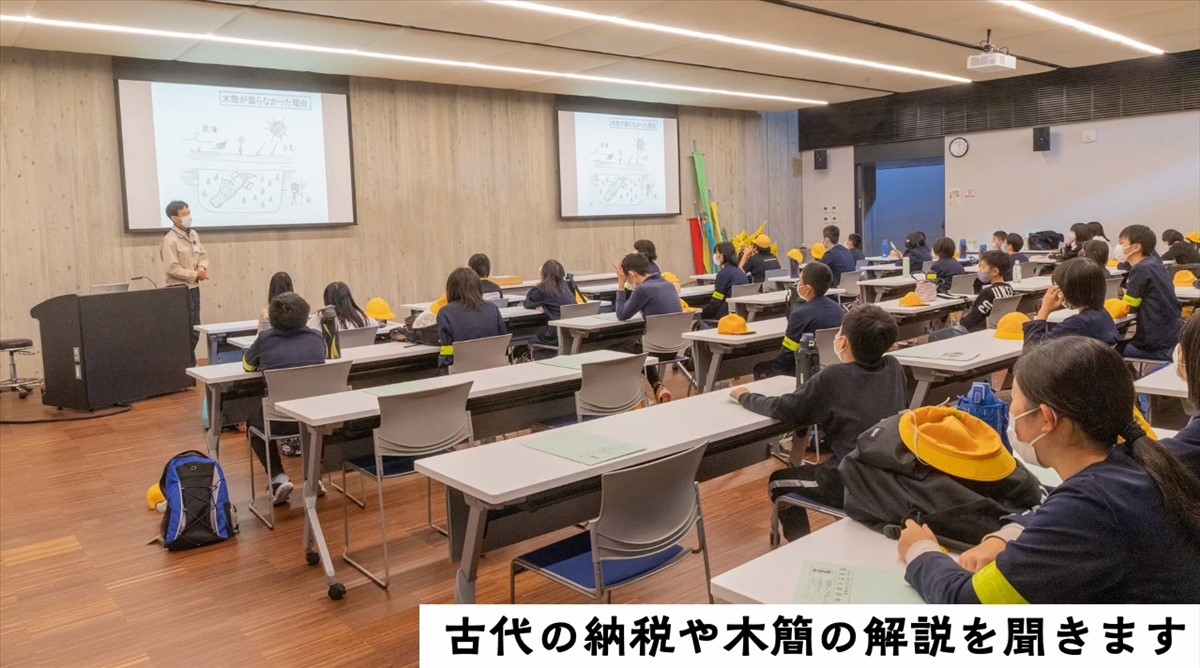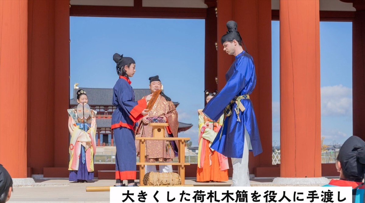 奈良文化財研究所では、出土遺物に因んだ地域間交流として、奈文研職員が天平人に扮して赤米を受け取るとともに、木簡や平城宮跡について解説をおこなっています。