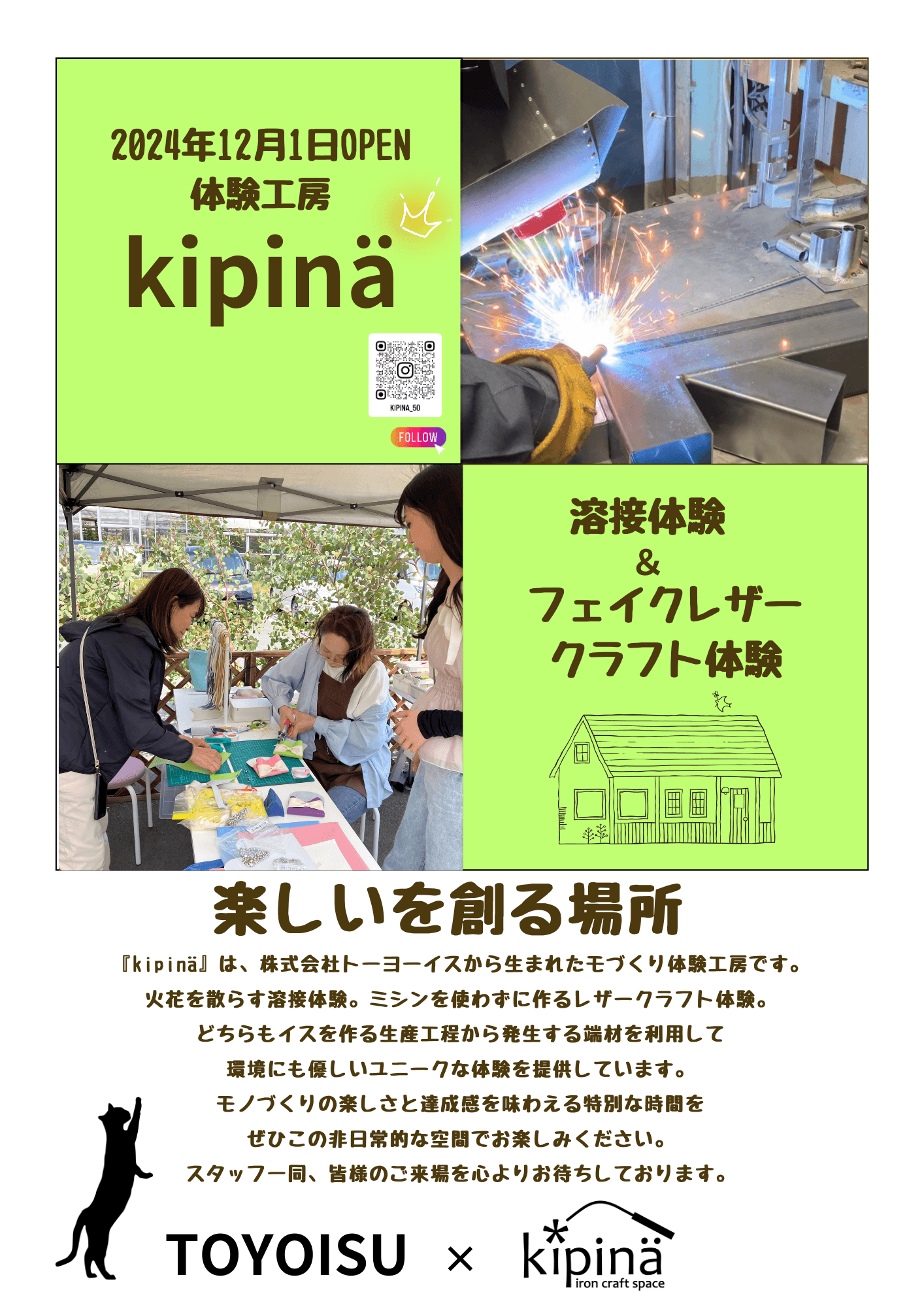 イスの製造の一貫生産を行う株式会社トーヨーイス(所在地:岐阜県海津市、代表取締役社長:伊藤 友美)は、モノづくり体験工房「Kipina」を2024年12月1日にオープンします。