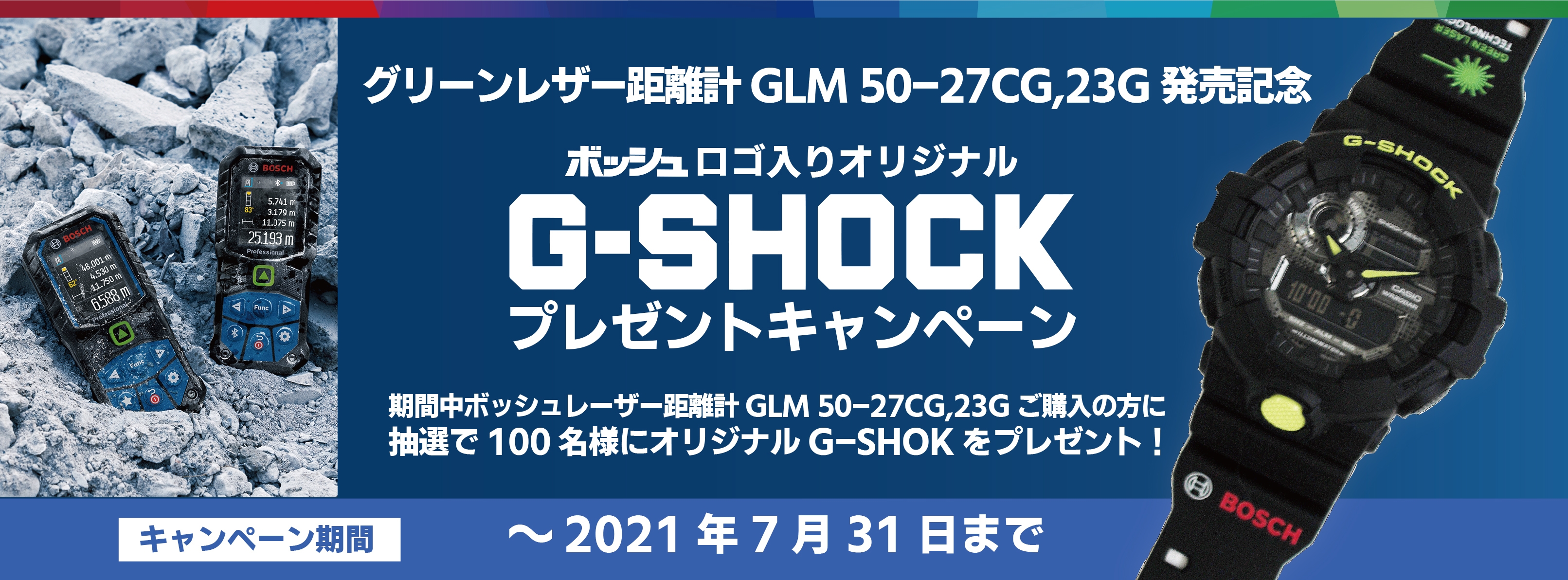 ■赤色レーザーよりも視認性の高いグリーンレーザーを採用 ■ラバーハウジングと骨格構造で設計され、1.5m落下テストクリア ※ボッシュ社内テスト ■ラバーシーリングにより、防塵性・防水性が強化 ■専用アプリで測定結果を文書化可能(GLM 50-27CG) ■【発売記念キャンペーン】対象商品ご購入の方に抽選で100名様に ボッシュロゴ入りオリジナルG-SHOCKをプレゼント