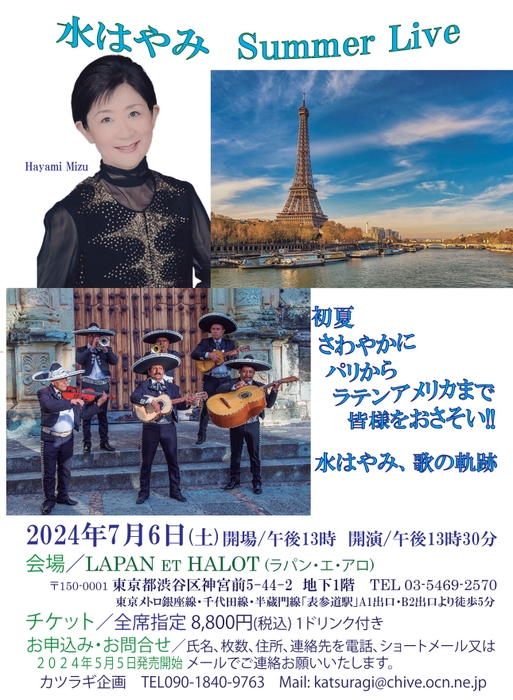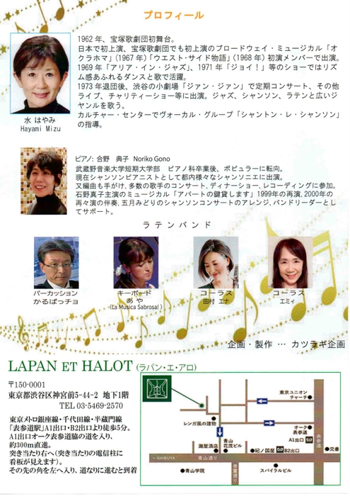 今回のライブは、宝塚の歌は1曲もなく、水はやみが伝説の渋谷小劇場「ジァンジァン」で歌い続けたカトリーヌ・ソバージュ等のシャンソン、FM東京の音楽番組で多種のジャンルを歌っていた頃のラテン等をご披露いたします。