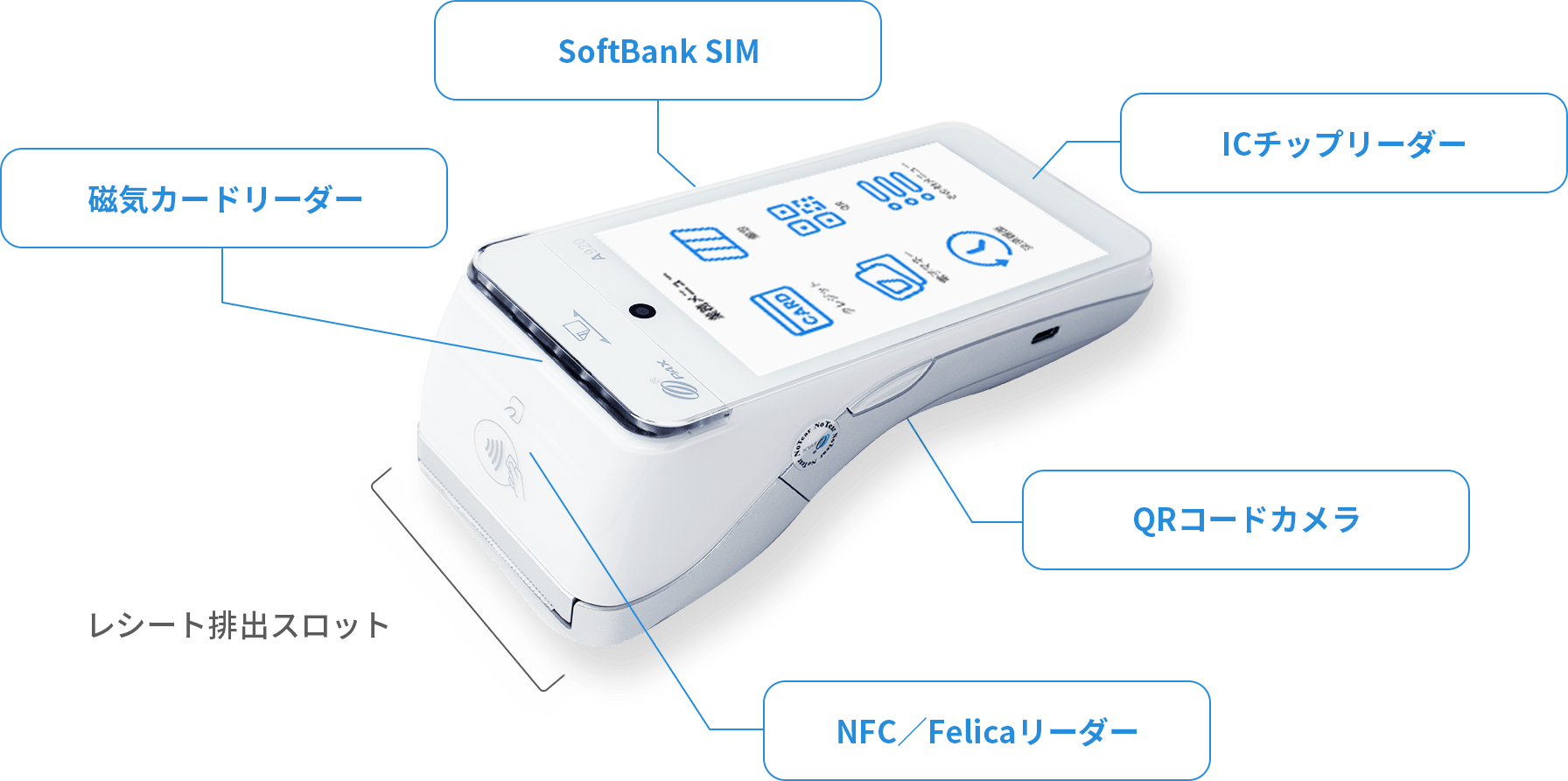 「PayCAS Mobile」は、片手に収まるサイズの決済端末で、クレジットカードから電子マネー、QRコード※2までさまざまな決済手段を利用できます。直感的な操作ができる5インチのタッチパネルディスプレイに加え、磁気カードリーダーとプリンターも搭載しており、決済からレシート印字まで端末1台でオールインワンに対応。すっきりとしたレジ周りを実現するとともに、SoftBank SIM対応で場所を選ばずどこでも決済できます。なお、POSシステムとの連動もWindows環境向けOCX※3を利用することで、スピーディーかつ低コストに開発が可能です。