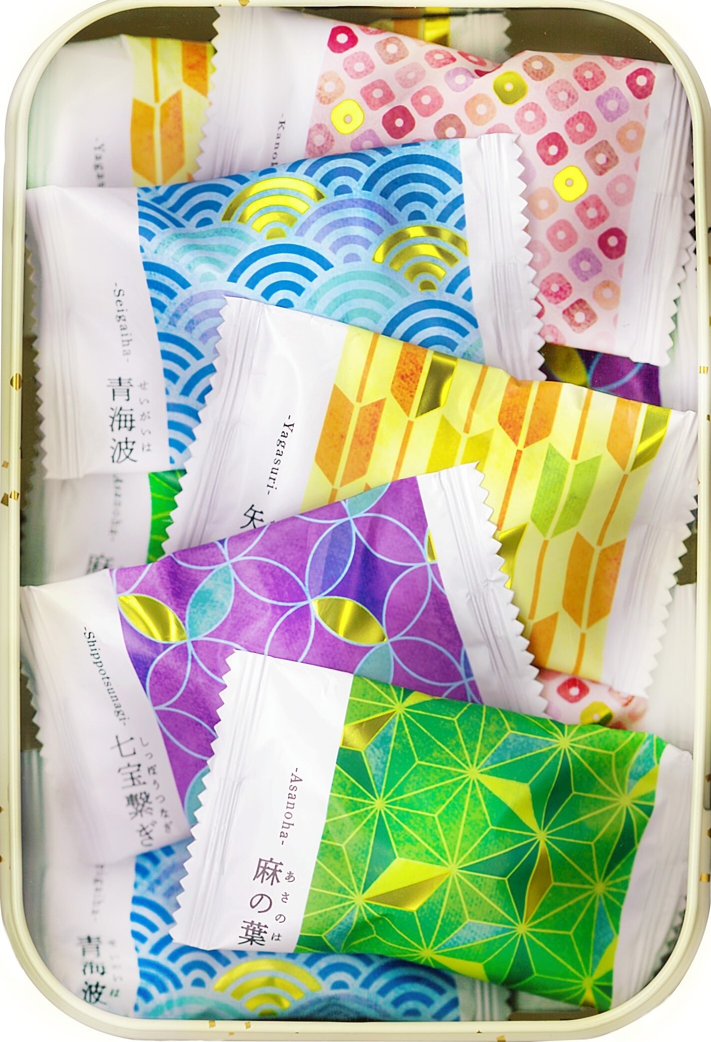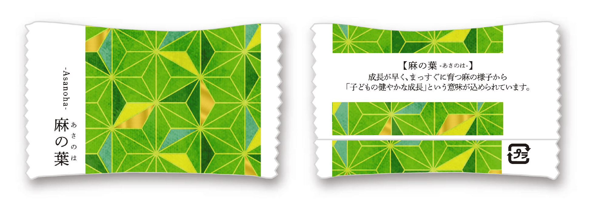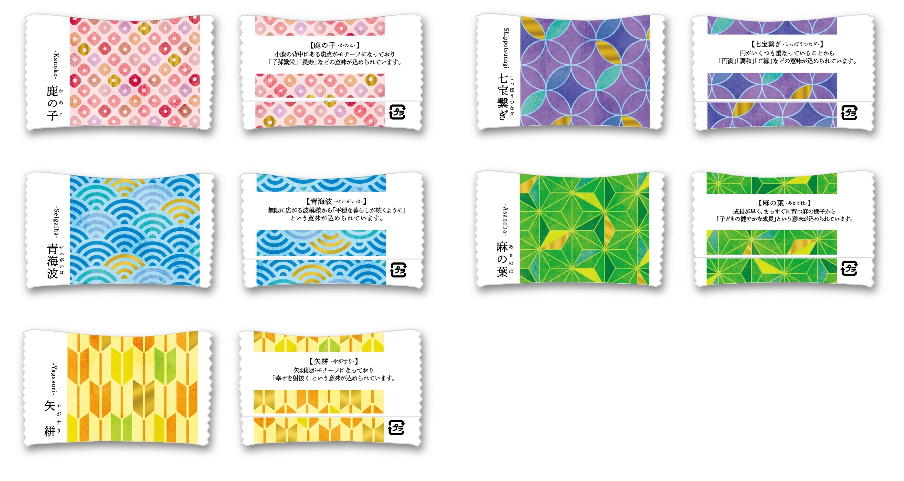 個包装フィルムには、縁起が良いとされる伝統文様(全5種)とそれらの模様が