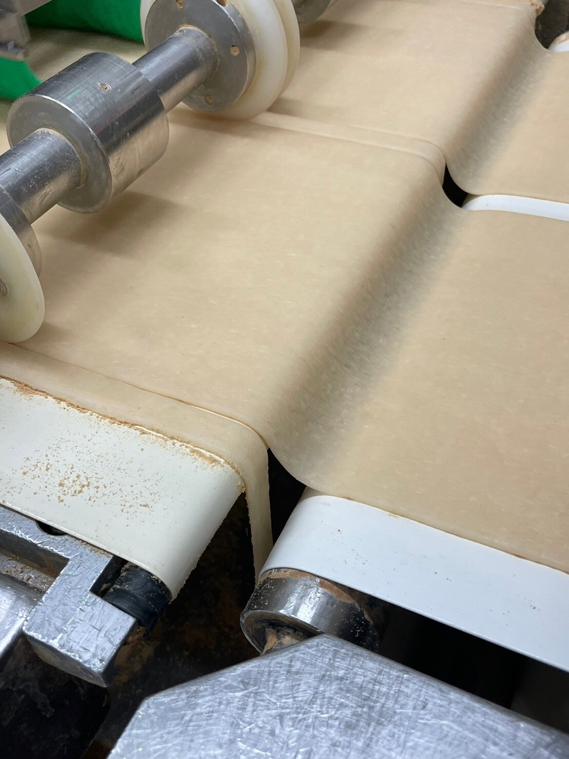 京都市にある「おたべ」を製造する京都工場では、生八つ橋生地を成型する工程で、綺麗な正方形にするために薄く延ばされた生地の端が切り落とされます。