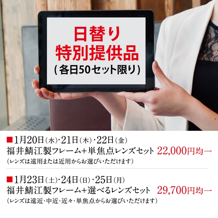 福井・鯖江製フレーム+レンズ付セットを各日50セット限り、お買得価格にてご用意いたします。
