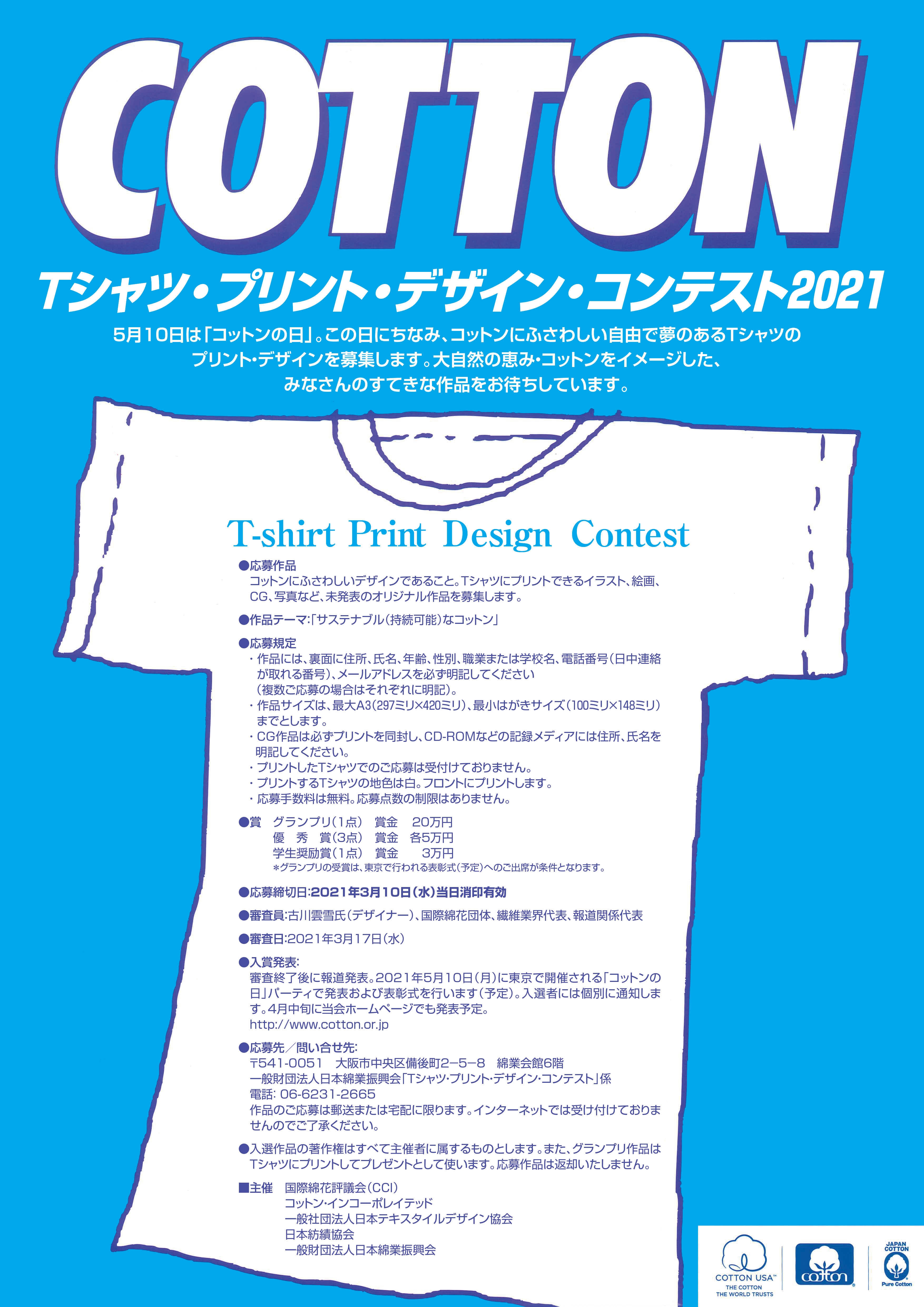 国際綿花評議会(CCI)と一般財団法人日本綿業振興会は、日本紡績協会、コットン・インコーポレイテッド、一般社団法人日本テキスタイルデザイン協会と共催で、「Tシャツ・プリント・デザイン・コンテスト2021」を開催します。