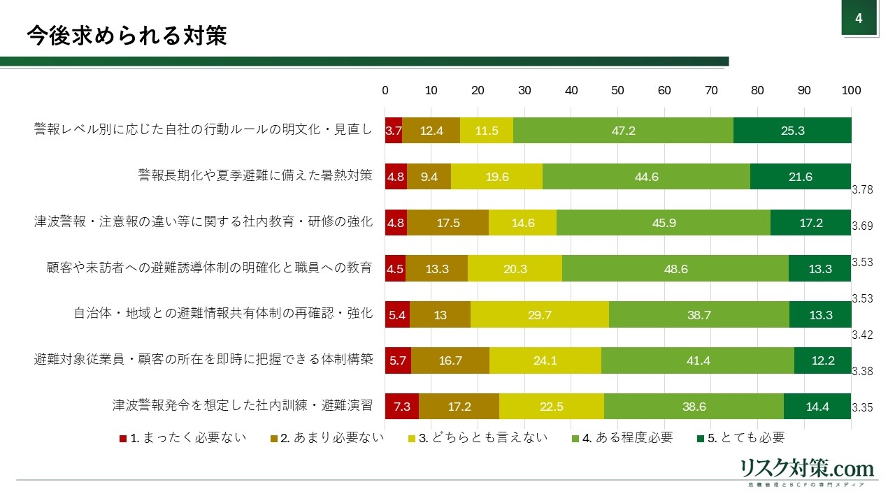 今回の津波警報を踏まえ、今後どのような対策が求められると思うかを、項目ごとに5段階で聞いたところ、「津波の警報レベル別に応じた自社の行動ルールの明文化・見直し」が平均値3.78で最も高く、次いで「警報長期化や夏季避難に備えた暑熱対策」(3.69)となりました。