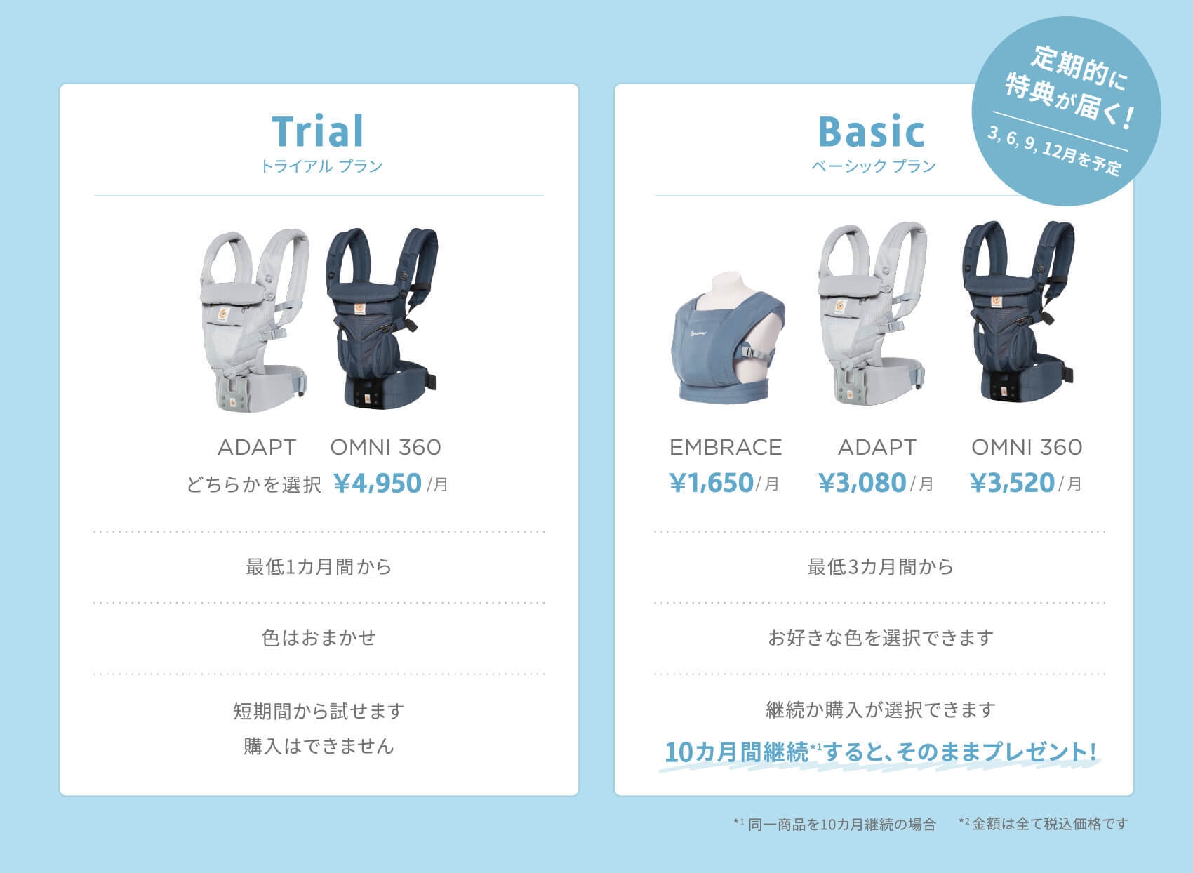 今回、当社では、新品をご提供することで購入時と変わらない感覚で気軽に試せるサブスクリプションサービスを開始いたしました。気になる抱っこひもを実際に使用した上で購入を検討できます。定価から差額のお支払いで購入可能のプランを用意しており、購入で迷われている方も安心してご利用いだけます。