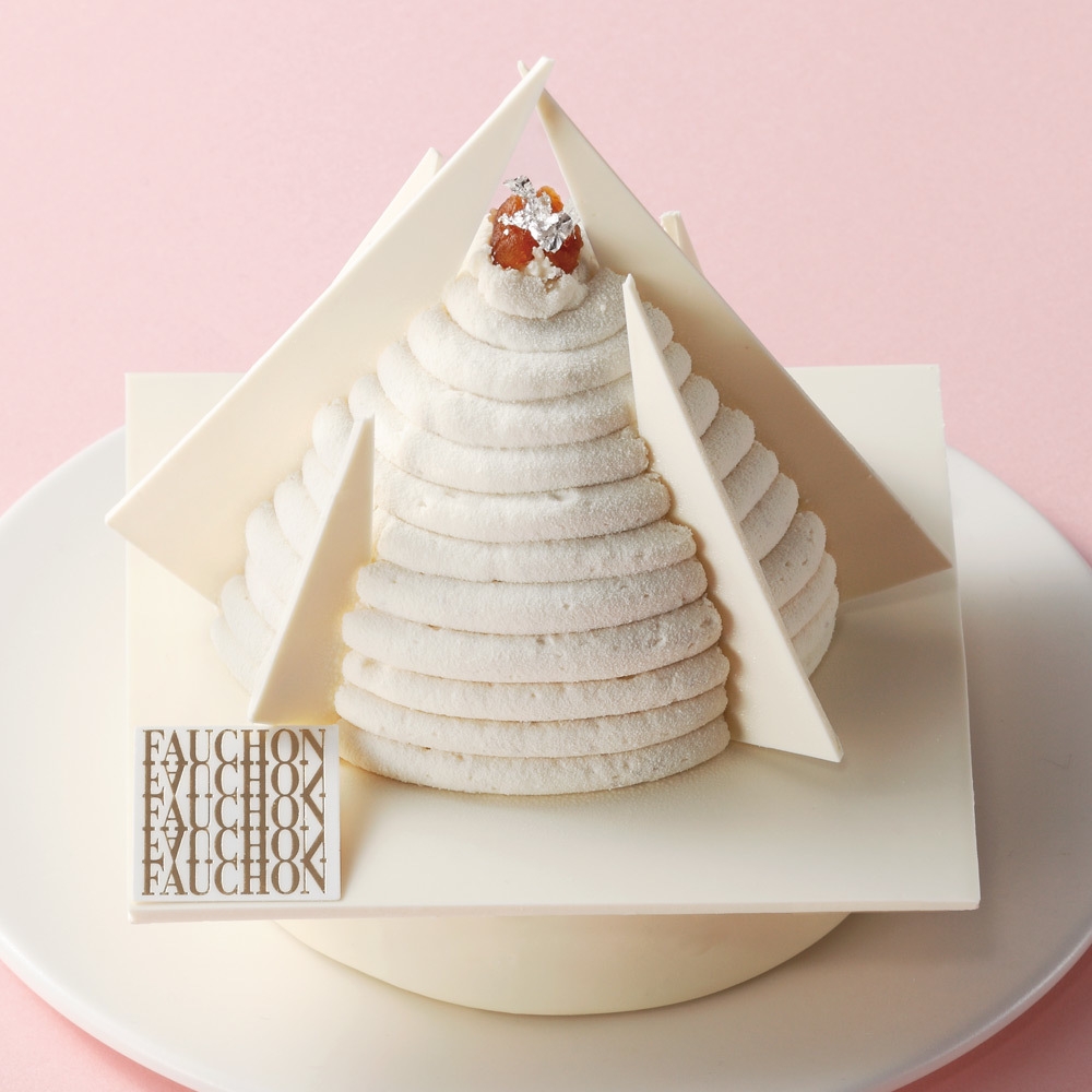 日本でも根強い人気を誇るモンブランをフォションスタイルで進化させ、クリスマスツリーをスタイリッシュにシャープに模った純白のクリスマスケーキ「ホワイトモンブラン」が再登場。聖なる夜に雪が降り積もるクリスマスツリーをイメージし、“モンブラン=白い山”の名前そのままに、真っ白に、かつアール・デコ調にデコレーションしました。パリのエスプリをきかせたデザインはもちろん、味わいにもこだわりが。上質なマロンムースの中にカシスやブルーベリーのゼリー、ビスキュイマロンを閉じ込め、バニラクリームを周りに絞り、仕上げにホワイトチョコレートを飾った清楚なケーキは、マロンの濃厚なムースと甘酸っぱいベリー系の絶妙のバランスを追求。なめらかなムースとクリームの中に忍ばせた、さくっと軽やかなビスキュイマロンのざくざくとした異なる食感もお楽しみいただけます。