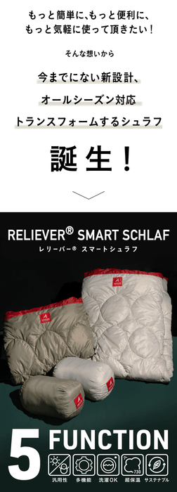 このレリーバー®スマートシュラフは、キャンプや車中泊だけでなく防災用としても、新設計された多機能なオールシーズンタイプのシュラフ”を開発。