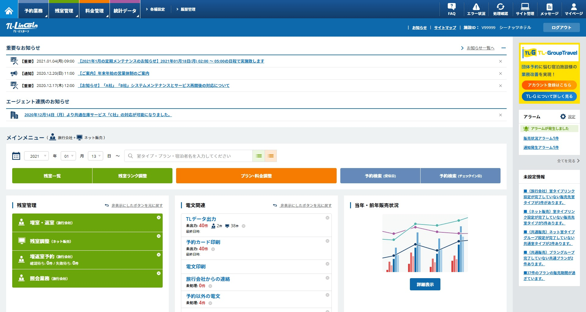 宿泊施設向けの予約・販売管理システム「TL-リンカーン」は、旅行会社とネット販売からの通知を一元管理し、残室・料金調整が一括でできるASPサービス。販売にかかる手間を削減でき、販売機会を最大限広げやすくなります。またホテルシステム(PMS)とのデータ連携も可能なため、通知情報の手入力、転記等の業務負荷も軽減。業務改善と増売を同時に実現することができます。