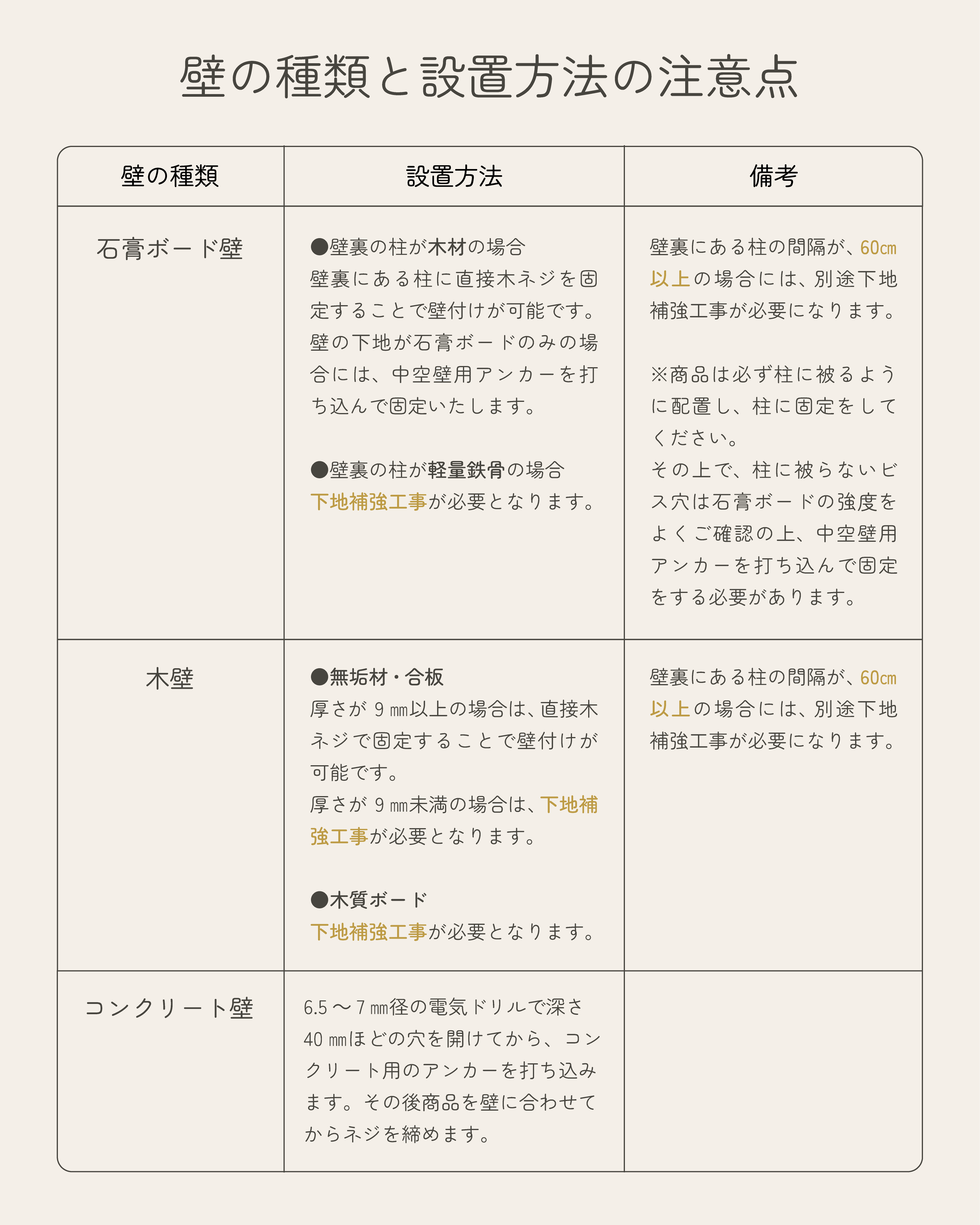 設置する壁の構造によっては別途下地補強工事が必要な場合があります。下地補強工事を行わない場合、設置したキャットステップが落下してしまう恐れがあります。お客様に安心してご依頼いただけるように、各商品ページとご利用ガイドページに「壁の種類と設置方法の注意点」を掲載しております。お客様にご確認いただくとともに現地調査で実際に確認して判断することで、より安全な施工を行います。