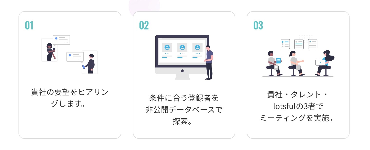 ・副業人材(タレント)とのマッチングは「lotsful」が行います。ご要望のスキルによってはご紹介できない場合もございますのでご了承ください。