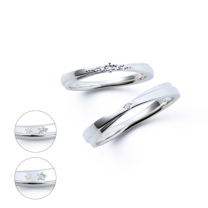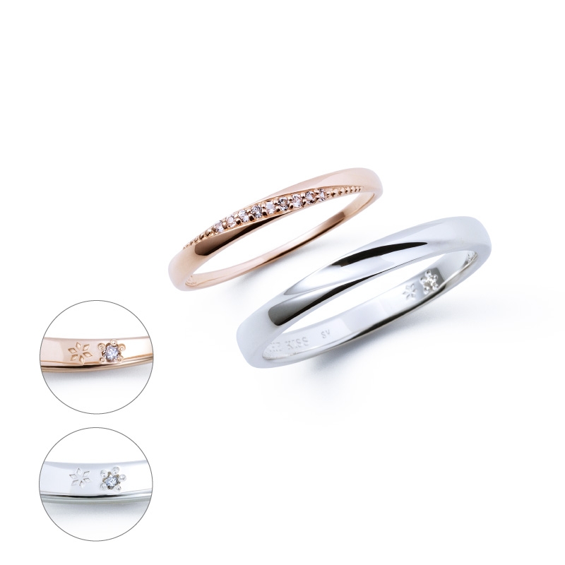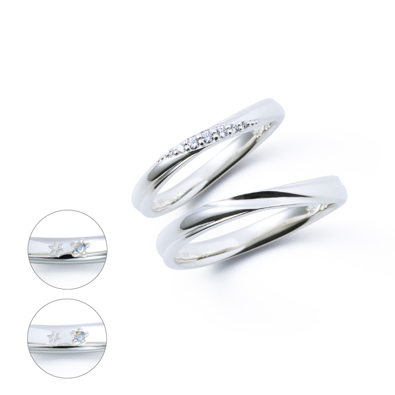 それぞれのリングの内側に、ダイヤモンドと「愛と幸福」を意味する雪の結晶モチーフがデザインされています。