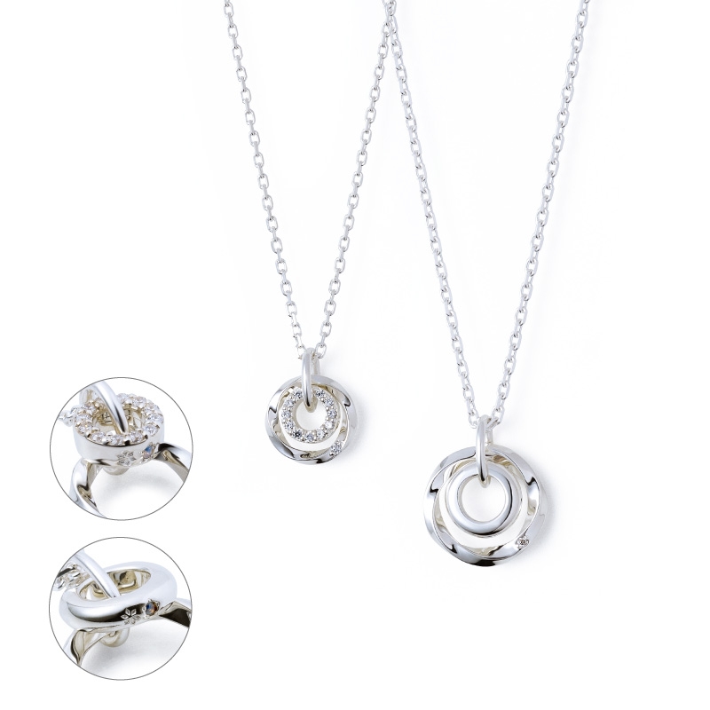 2つのデザインの、それぞれ異なるきらめきが魅力のダブルリングのペアネックレス。