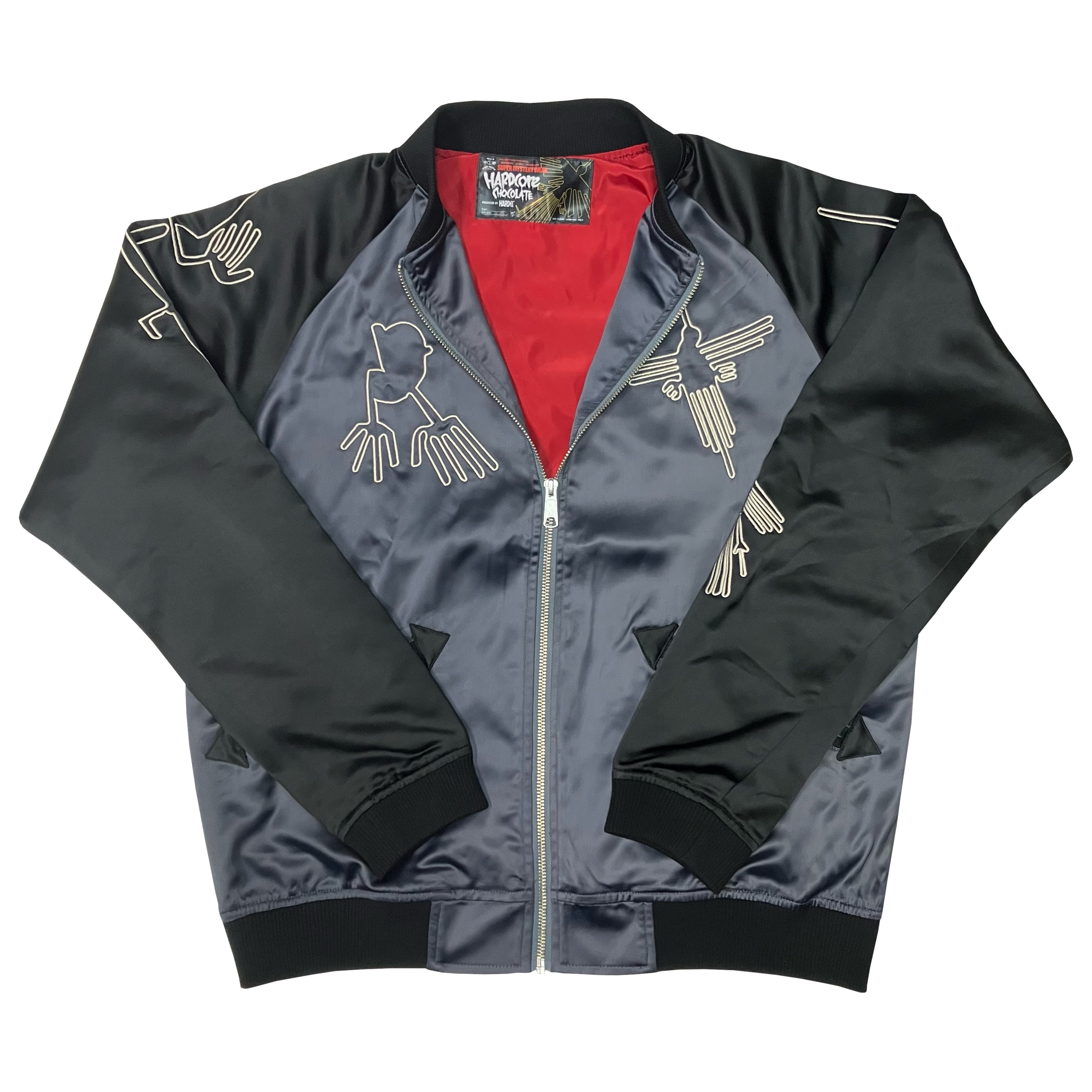 もう1種のサテンナスカジャンは、胸と背中が鋼のようなグレーで登場。