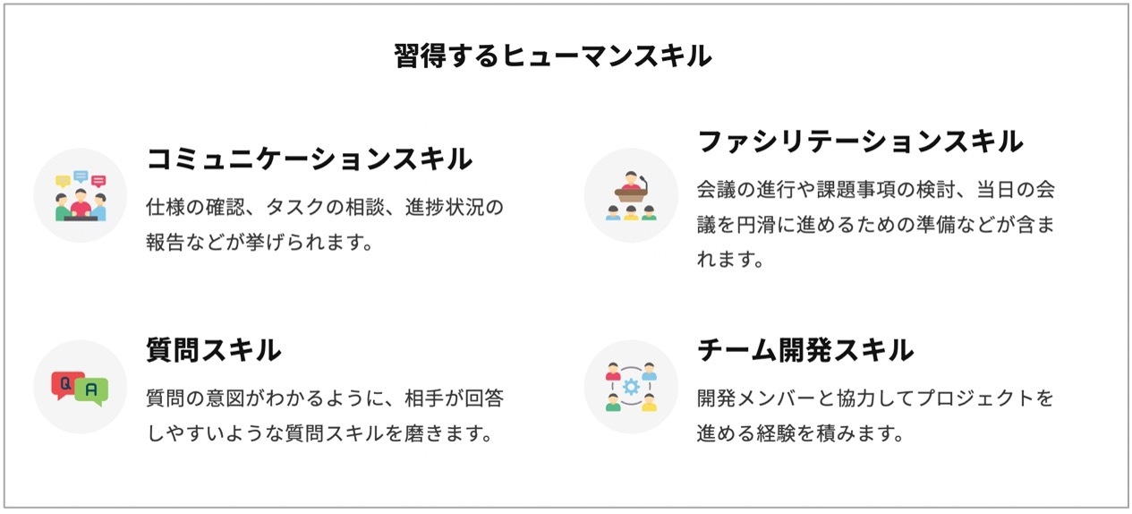 また、PRUMでは、エンジニアのスキルとして社会から認識されにくい「ヒューマンスキル」を重視し、「PRUMエンジニア留学 for Biz」には以下の4つをヒューマンスキルとして磨けるようにしています。