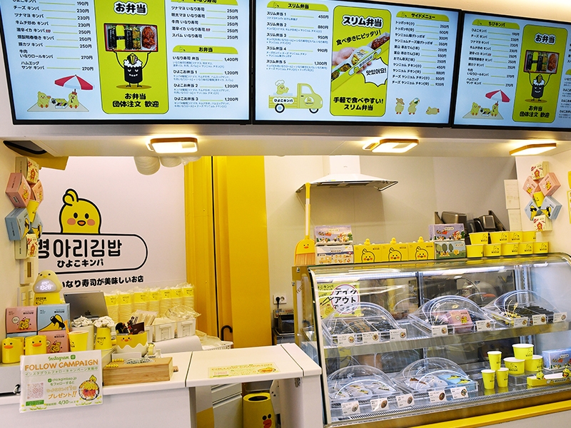 韓国・明洞のかわいいキンパ専門店『ひよこキンパ』が日本初上陸。食べ歩きにちょうど良いミニサイズのキンパは、ご飯に炙ったおあげを混ぜることで他とは少し違った味わいに!種類豊富なキンパとキンパいなり寿司は出来立てを提供しています。キムチキンパ(230円)と牛肉いなりロールキンパ(270円)、いなり寿司はスパムいなり寿司(250円)が人気です!