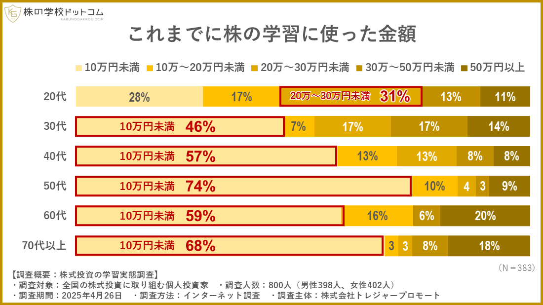 では、それぞれの年代で、株式投資の学習に対してどれくらいの金額を使っているのでしょうか。これについても、20代とそれ以外で異なる傾向が浮き彫りになりました。