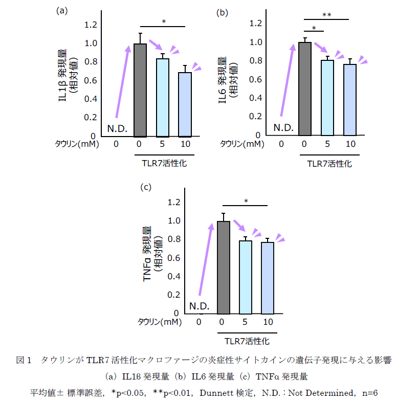 その結果、TLR7活性化によるIL1β、IL6、TNFαの遺伝子発現量の増加は、タウリンによって抑制されました(図1)。