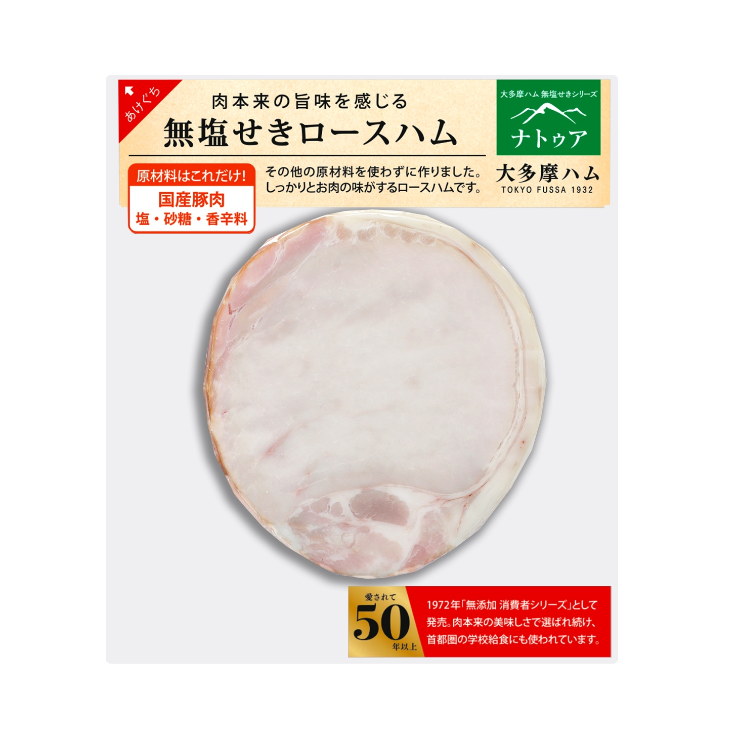 販売から50年余りの2023年、本商品の価値をもっと多くの方々に認知してもらいたくリブランディングすることといたしました。新ブランド名は「大多摩ハム無塩せきシリーズ ナトゥア」となります。