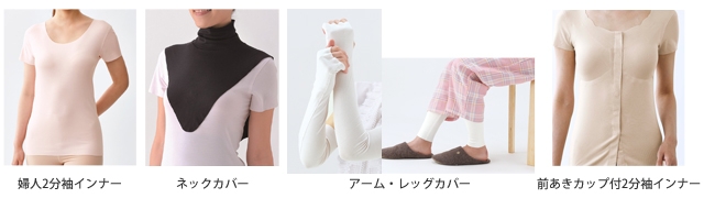 今回、皮膚科クリニックで販売する製品は、肌ざわりが滑らかなレーヨン混素材を使用した「低刺激インナー」「ネックカバー」「アームレッグカバー」「カップ付インナー」の4商品です。治療に加えて皮膚科医のすすめる刺激の少ない肌着を着用することで患者さまのお役に立てるものと考えています。
