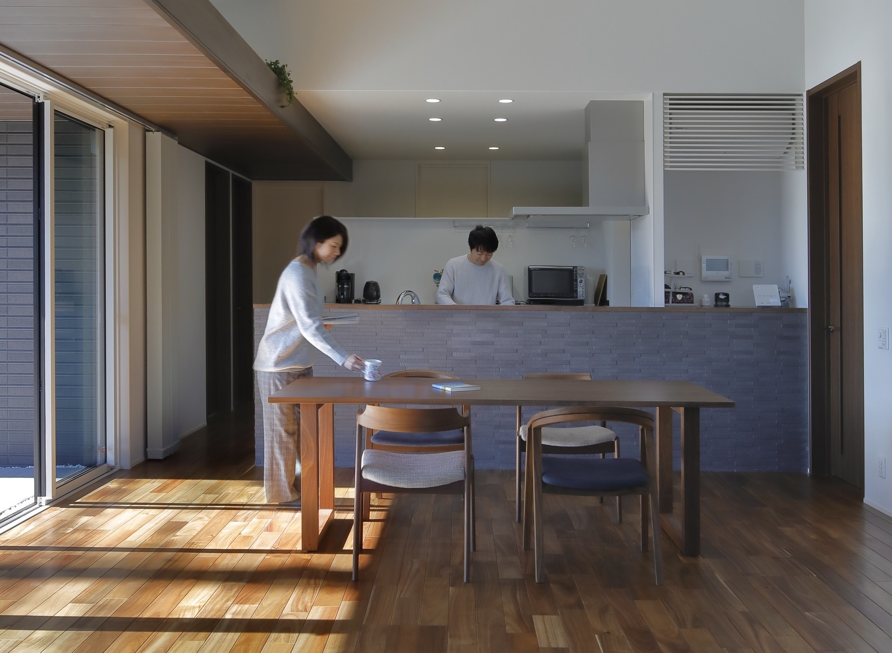 敷地が東南の角地であることから、最も日当たりがいい東南にLDKを配置しました。片流れ屋根によって勾配した高い天井の大空間には、大開口からたっぷりと光が差し込みます。明るく開放感のあるリビングは居心地がよく、ついつい長居したくなる場所です。