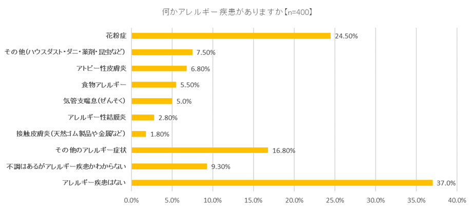 「アレルギー疾患はない」と回答した人は37.0%、「不調はあるがアレルギー疾患かわからない」と回答した人も9.3%いたものの、何らかのアレルギー症状を自覚している人は半数以上の53.7%にのぼりました。