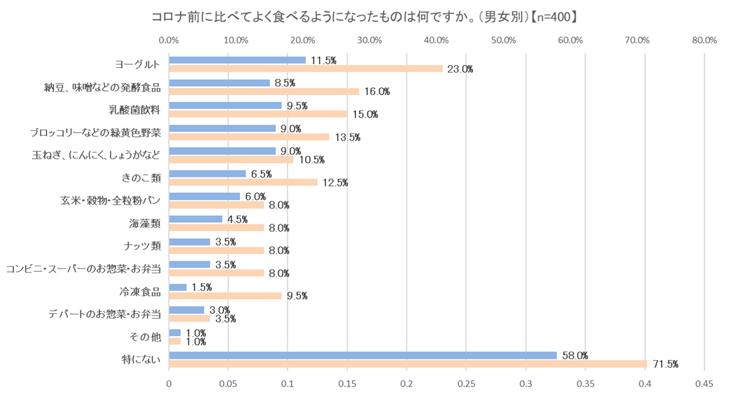 ◆コロナ前に比べてよく食べるようになったものは、ヨーグルト(17.3%)に続き、納豆、味噌などの発酵食品(12.3%)、乳酸菌飲料(12.3%)がランクイン