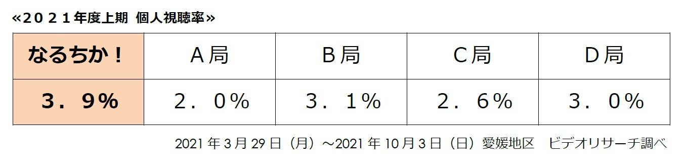 愛媛朝日テレビ「なるちか!」2021年度上期個人視聴率同時間帯1位獲得!
