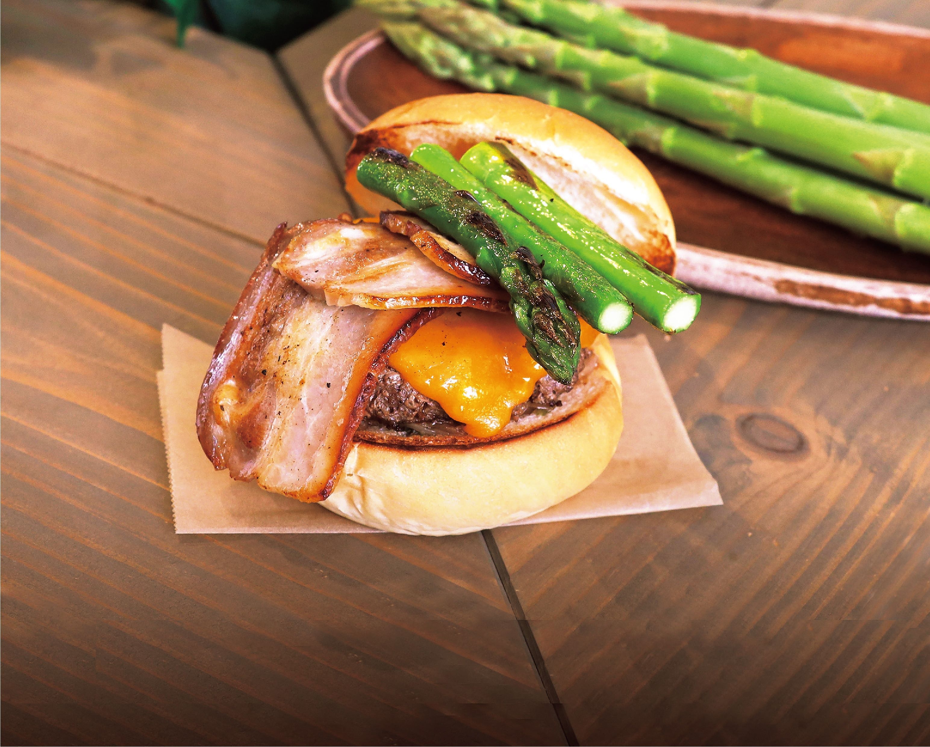 グリーンアスパラ、ベーコン、こだわりのパティが絶妙にマッチしたバーガーを東武限定でご用意。