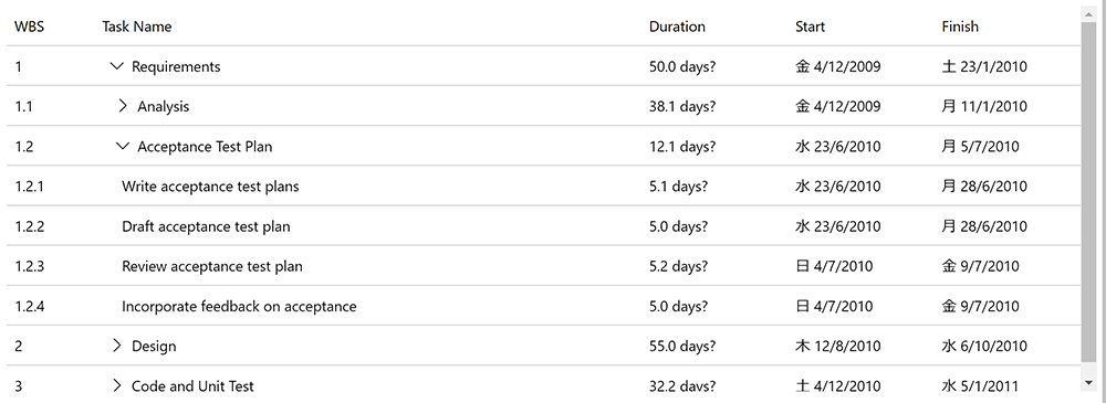 親子関係があるデータを階層化して表示できる「ツリーグリッド」に対応しました。ノードの表示位置とノードのインデントをカスタマイズできるほか、複数のプロパティをコンマで区切って指定することで、階層ごとに子ノードとして表示するデータを切り替えることができます。