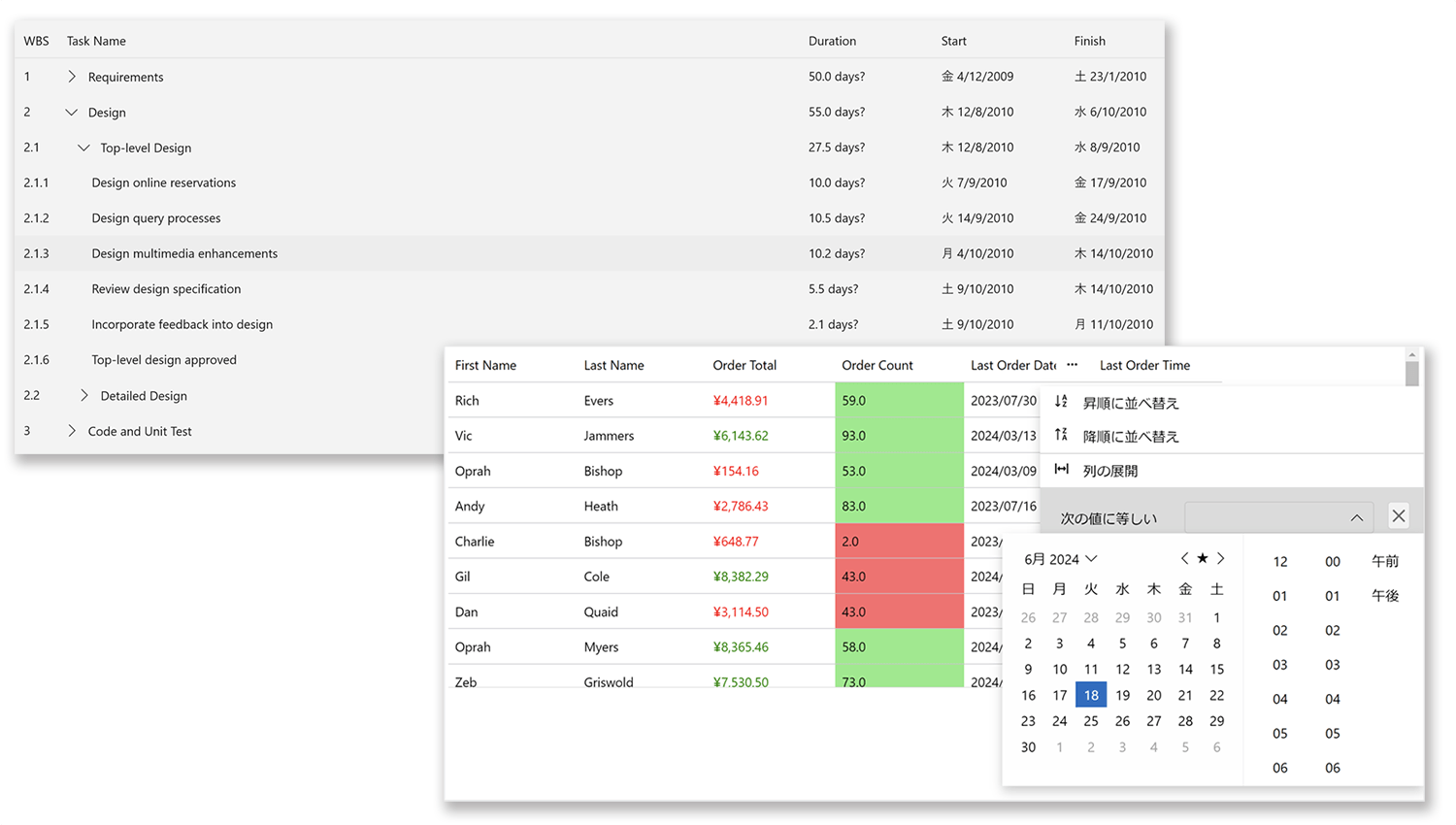 また、BlazorエディションのFlexGridでは、独自のカスタムフィルターを表示できる機能を追加しました。さらに、日時形式でフォーマットされた列に対して、日付値に加えて時刻値でのフィルタリングも可能になりました。フィルター機能が一層強化され、システム利用者はデータ検索や分析をより効率的に行うことができます。