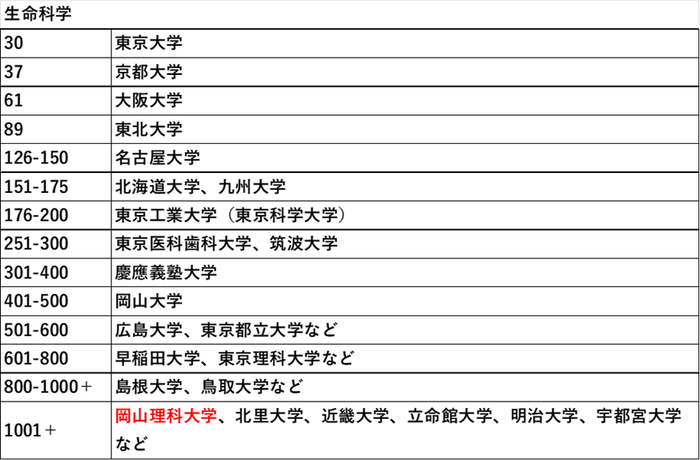 岡山理科大学がランクインした「物理科学分野」では、物理学、化学、数学、天文学、地質学、環境・地球学など、「生命科学分野」では、獣医学、生物科学などの主要分野で大学が評価されます。