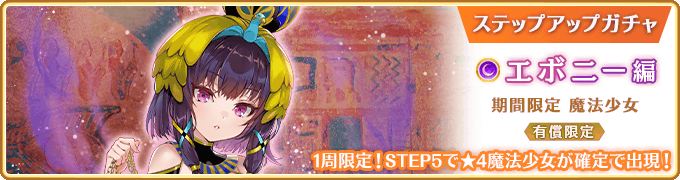 ・同時開催の『有償限定 ステップアップガチャ エボニー編』での★4魔法少女1体確定までのカウントは『期間限定 エボニー ピックアップガチャ』には引き継がれません。