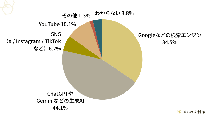 調べ物の出発点は依然検索エンジンが主流(56%)という結果でしたが、生成AIを最初に使う人も22%に達し、利用行動が多様化しつつあります。